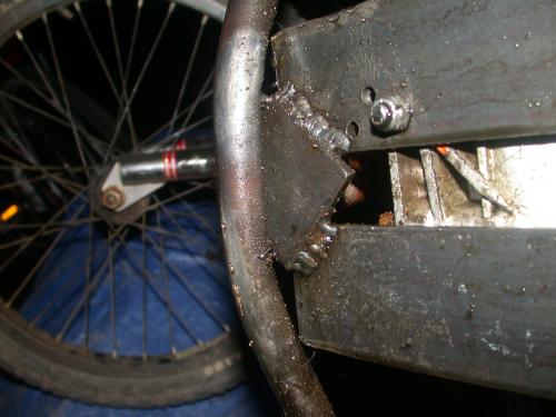 Here is a picture of the front frame after being cut and rewelded to make room for the motor. While I had the front apart I also cut the top part of the frame and took about an inch out of it to tilt the front end back and give it a board track racer look. I also welded a piece of thick sheet metal to the bottom of it to improve structural strength.