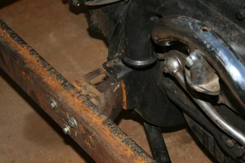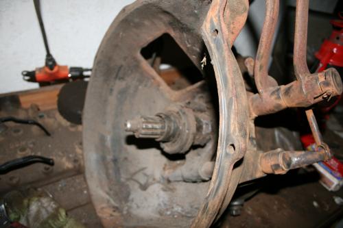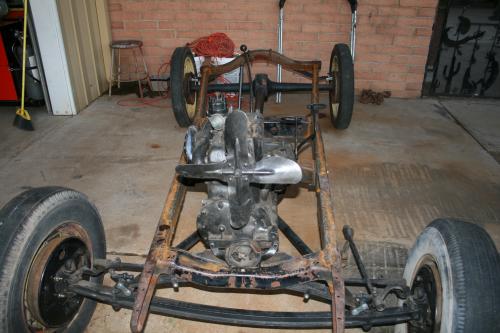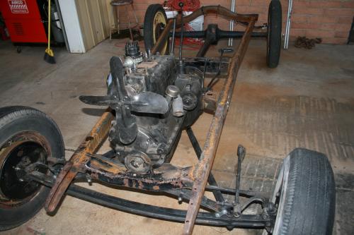 I tried to put in the 4- banger and guess what, it didn’t fit and I realized I had drilled the holes about 1/4″ to far back and I didn’t have time to fix it this weekend but after the holidays I will have some time to get the motor in. I have started to work on my V8 and man is that a pain because it is frozen and some the nuts are really hard to get to without turning the motor. I also plan to get the brakes hooked up, all they need is shoes and some cleaning and then they are ready to go.