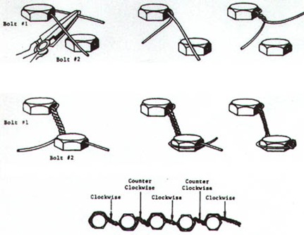 Here is a nice little reference for how to tie safety wire and correct patterns for different configurations: