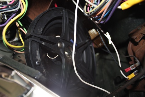 My left channel speaker is mounted right under the headlight switch behind the steel dash panel