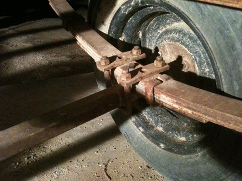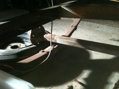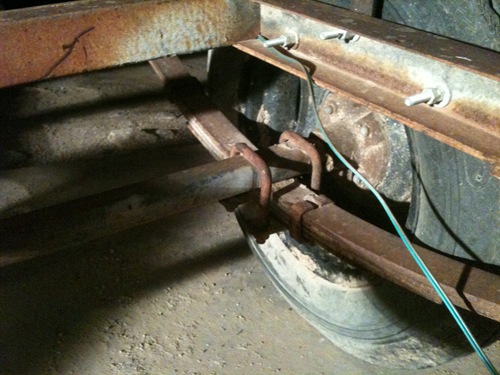 First you will need to remove one of the tires so you can remove the axle. Once that is completed you need to remove the U-bolts holding the axle to the leaf spring.