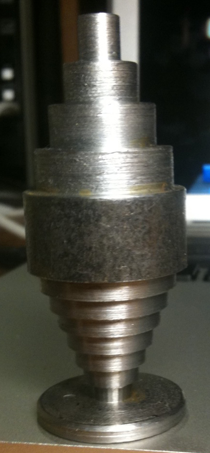 This was done by turning each 1/4″ on the top down to a uniformly smaller dimeter and every 1/8″ on the bottom down by 1/2 the diameter of the 1/4″ part.