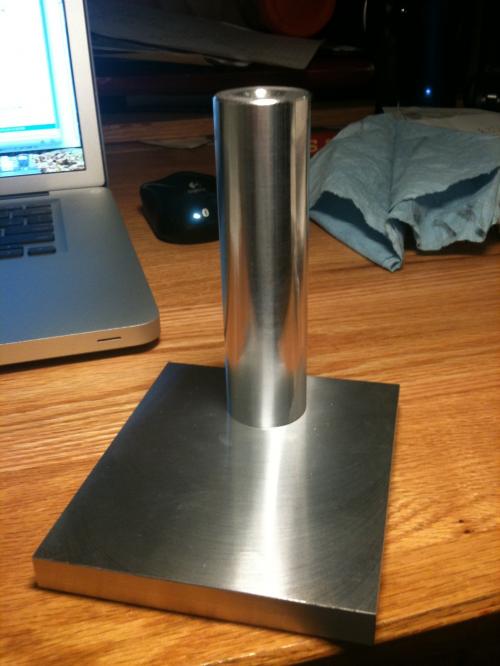 Small desk lamp. It consists of a flat base plate of aluminum. I drilled and taped a hole in the base for the stem which was threaded and turned on a lathe. I then fly cut the base for a nice finish. There is a hole that is threaded in the top of the stem for a lamp socket to screw into.