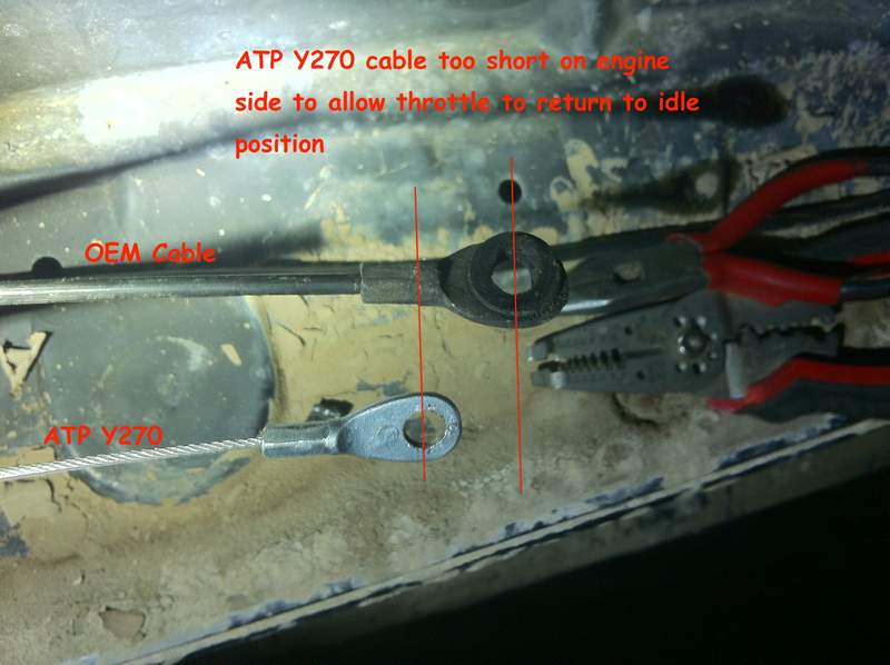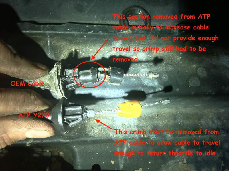 Both cables are the correct overall length with the correct end fittings so they can be modified to work. The on the gas pedal side of the cable there are two pieces of metal crimped onto the cable. The crimped piece on the engine side of the plastic clip (the piece that pushes into the hole on the gas pedal) needs to be removed, increasing the amount of travel in the cable. This will give enough travel in the cable to allow the injection pump to return to idle. To remove the crimped piece use a file (or grinder if you are very careful) to wear down the piece until you reach close to center (where the cable runs though) and then carefully bend/work the crimp off the cable. Special care needs to be taken so as to not damage or cut the cable. With this piece removed, the cable will install and work just like the OEM cable.